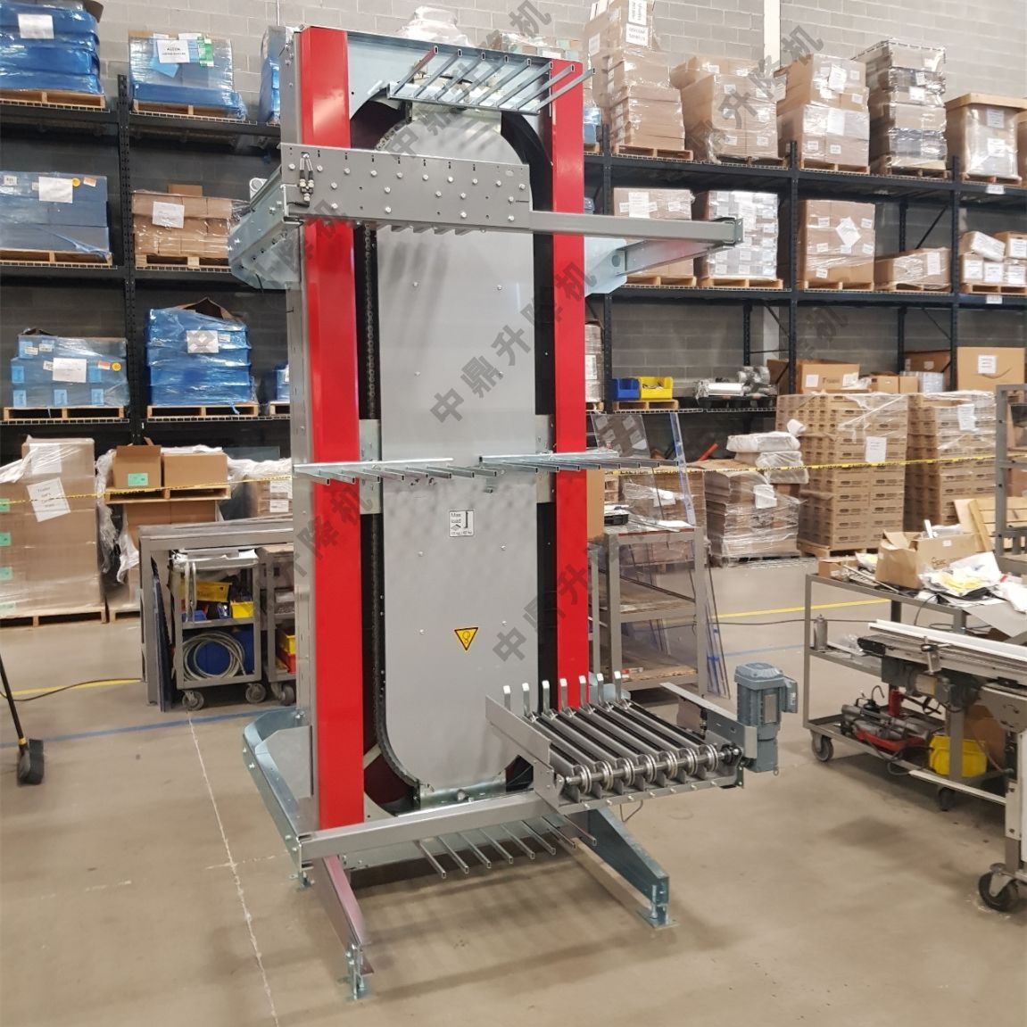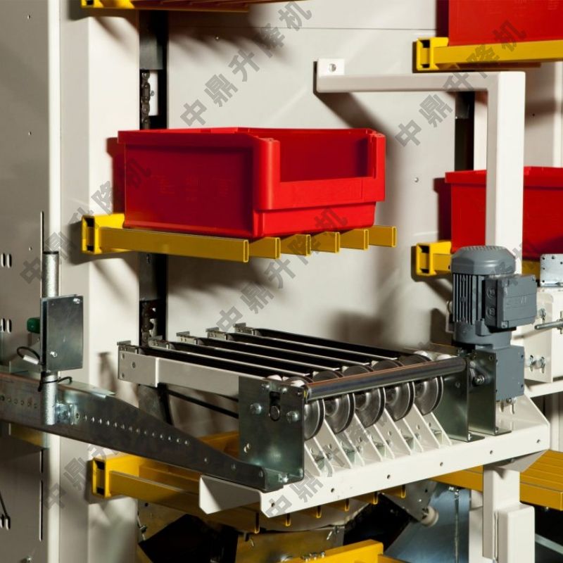 3. 垂直提升‌:伺服電機驅動鏈條循環運行,叉臂沿垂直軌道穩定提升,避免物料散落‌