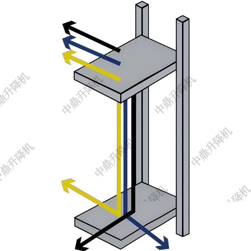 懸臂式往復式提升機的貨廂由兩根導軌柱支撐,位于貨廂的一側。這種配置使得VRC的三側均可方便訪問,并支持三種裝卸方式:C型裝卸(從前方進出)、Z型裝卸(從對側進出)和90度裝卸(從前方裝載,側面卸載)。懸臂式配置提供更高的裝卸靈活性,特別適用于空間受限的區域,能夠更方便地操作貨物。