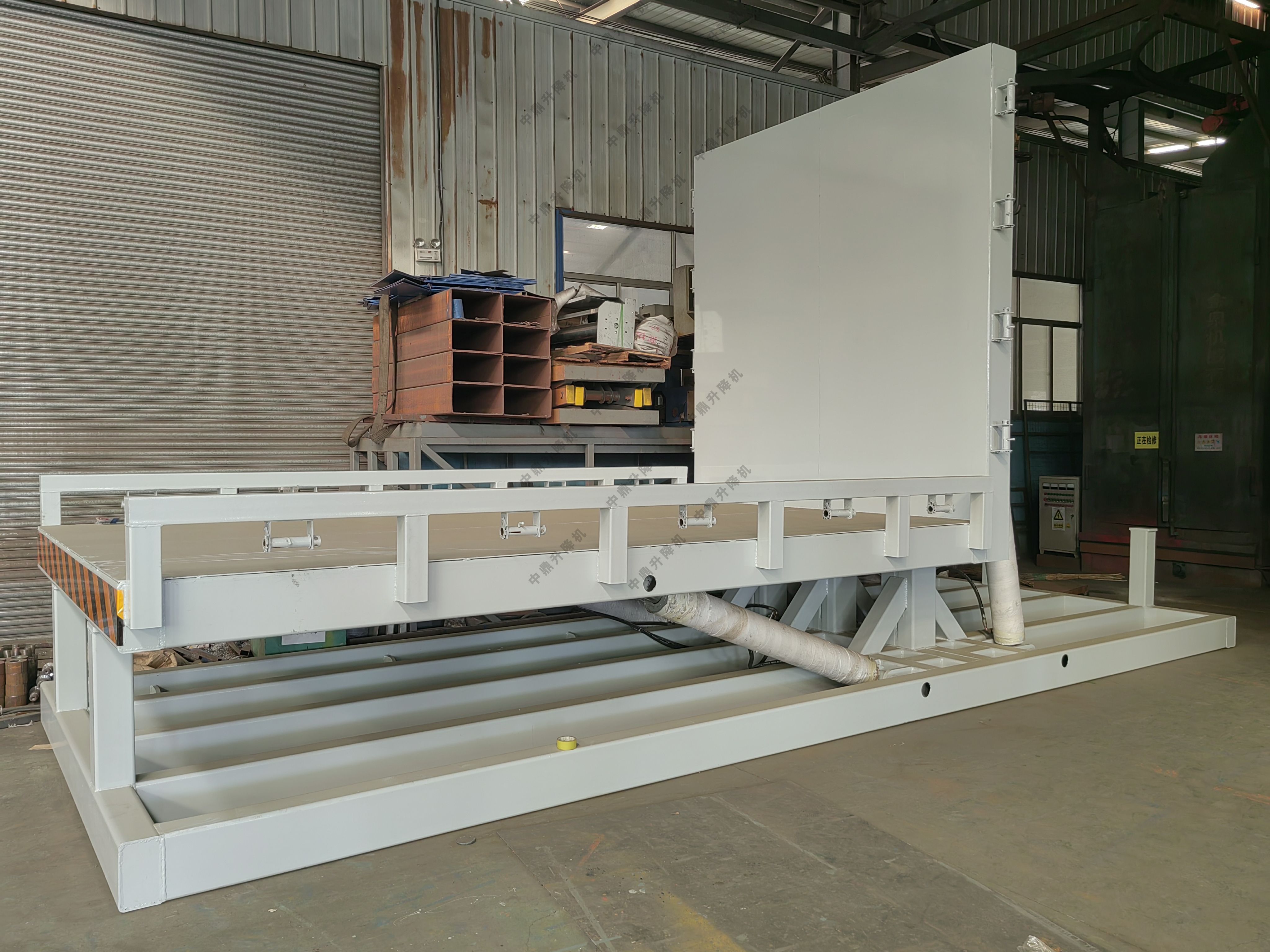 使用工況:行吊將制冷設備吊至翻轉平臺上,制冷設備由站立狀態翻轉90度后放置水平然后行吊吊走;翻轉臺面兩側帶有防護護欄,及固定緊繩器,可將產品用繩索固定,防止產品側向滑落到地面。